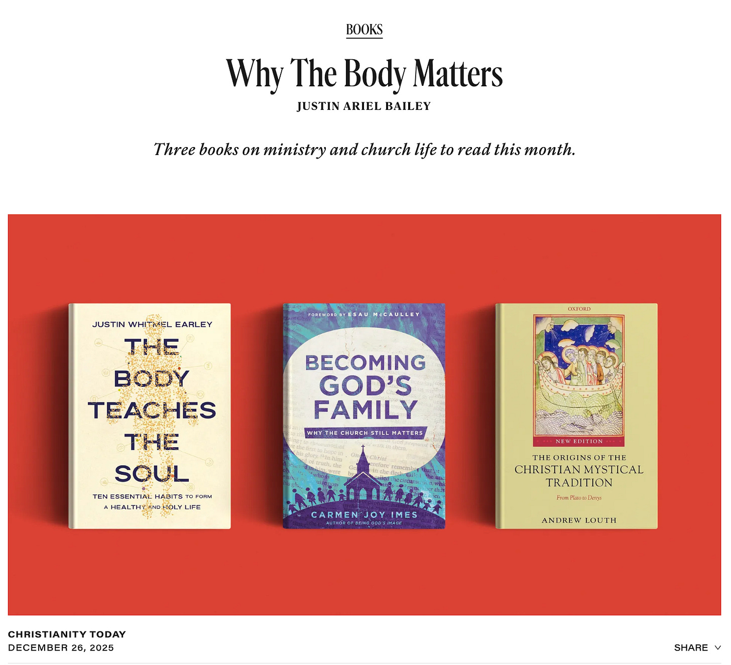 On a warmer note, CT also just published my shorter review of three books about the importance of the body - both our physical bodies as well as the Body of Christ. Here’s one paragraph: